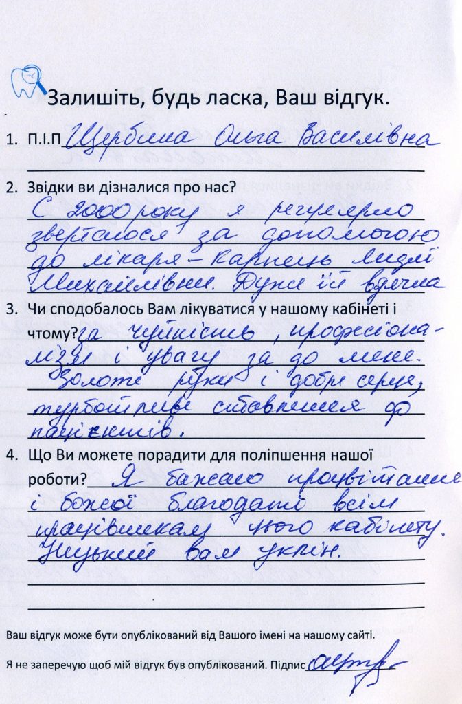 З 2000 року я регулярно звертаюся за допомогою до лікаря – Капець Лідії Михайлівни. Дуже їй вдячна за чуйність, професіоналізм і увагу до мене. Золоті руки і добре серце, турботливе ставлення до пацієнтів.